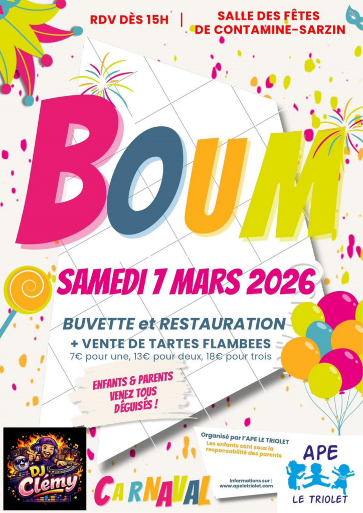 Nous sommes ravis de vous convier à notre boum déguisée, qui se tiendra le samedi 7 mars 2026, de 15hà 21h, à la salle des fêtes de Contamine-Sarzin.